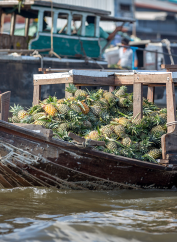 Départ très tôt le matin pour une excursion en bateau vers le marché flottant de Cai Rang. Observation des échanges commerciaux sur l’eau, véritable symbole authentique de la vie fluviale du Mékong.