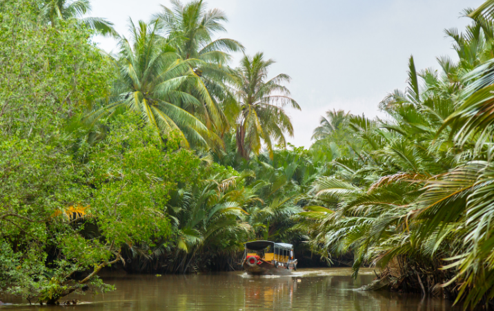 Départ matinal vers Ben Tre, province emblématique du delta du Mékong. À l’arrivée, embarquement sur un bateau local pour naviguer sur les canaux ombragés bordés de cocotiers, dans un décor authentique.
