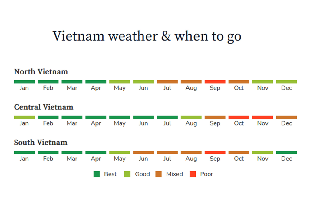 Le Vietnam possède un climat très diversifié selon les régions. Il n’y a pas de période idéale pour visiter l’ensemble du pays ; tout dépend du calendrier choisi.
